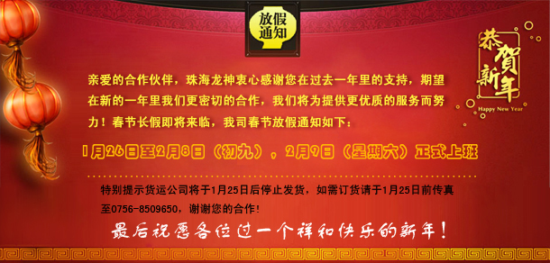 2014年春節(jié)放假通知 2014-01-16 10662 親愛的合作伙伴,珠海龍神衷心感謝您在過去一年里的支持,期望在新的一年里我們更密切的合作,我們將為提供更優(yōu)質(zhì)的服務而努力!春節(jié)長假即將來臨,我司春節(jié)放假通知如下:1月26日至2月8日(初九),2月9日(星期六)正式上班。特別提示貨運公司將于1月25日后停止發(fā)貨,如需訂貨請于1月25日前傳真至0756-8509650,謝謝您的合作!最后祝愿各位過一個祥和快樂的新年!