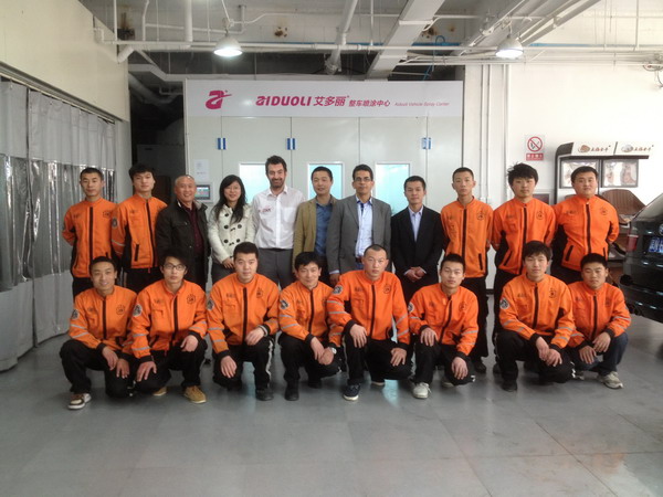2013年特邀國外專家赴北京車爵士演示車縫泡膠條的使用 2013-04-08 12109 本司訊:2013年4月北京晴空萬里,龍神公司特邀英國專家一行五人,來到了北京車爵士進行汽車噴涂遮蔽技術交流。首先公司一行了解車爵士的汽車噴涂情況及詢問了使用的遮蔽工具情況。隨后英國專家針對在汽車噴漆時難噴涂的車門縫隙、玻璃死角等地方的專業(yè)遮蔽工具的演示。車縫泡沫膠:用于車身所有縫隙的遮蔽,有效隔離及遮蔽漆霧噴入車縫里。
