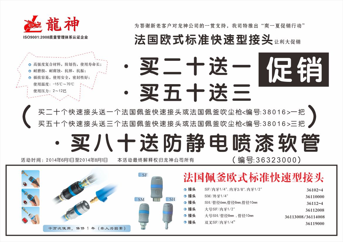 1、買二十送一(即買二十個快速接頭送一個法國佩釜快速接頭或法國佩釜吹塵槍(編號:38016)一把)