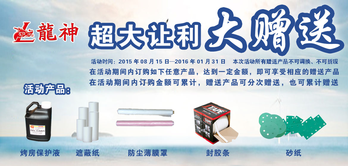 超大讓利﹒大贈(zèng)送 2015-08-17 31870 訂購產(chǎn)品:1、烤房保護(hù)液; 2、遮蔽膜; 3、遮蔽紙; 4、泡沫膠條; 5、砂紙。 在活動(dòng)期間內(nèi)訂購如上任意產(chǎn)品,達(dá)到下表累計(jì)金額,即可享受相應(yīng)的贈(zèng)送產(chǎn)品。